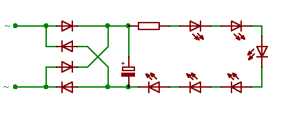 Version vom 10. Mai 2006, 06:02 Uhr von HaJo Hachtkemper (Diskussion | Beiträge) (Brückengleichrichter, Siebelko, Vorwiderstand und 6 LED)