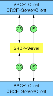 Schemazeichnung zum Nachrichtenfluß bei einem Betrieb mit als CRCF-Servern und -Clients arbeitenden SRCP-Clients